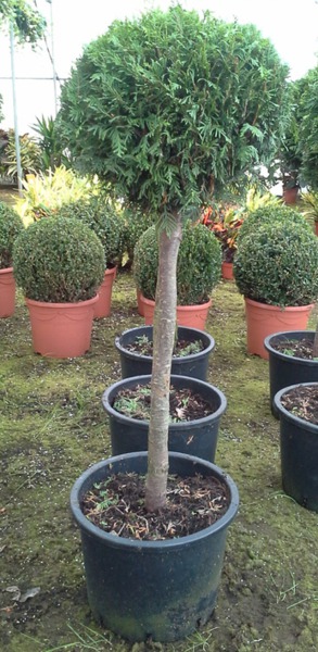 Thuya Occidentalis Brabant en maceta de 40 cm y 125 cm de altura. Forma de arbol en copa.