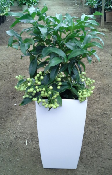 Ardisia Crenata en maceta de 14 cm y 45 cm de altura. Con bayas rojas o blancas. Maceta decorativa no incluida.