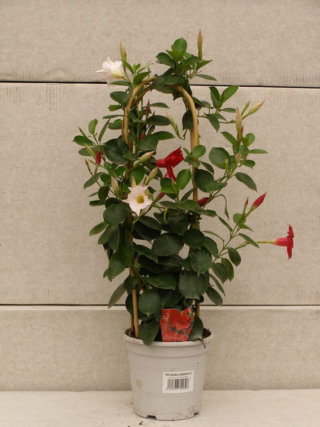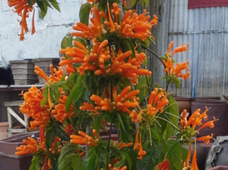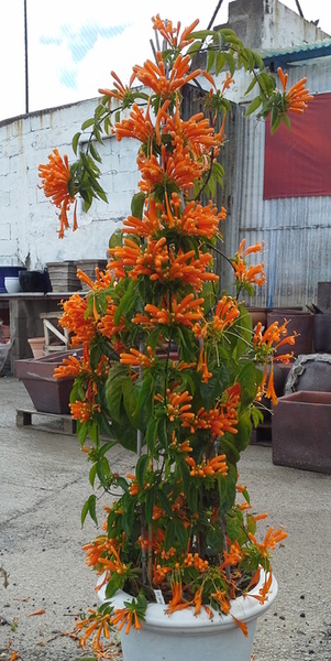 Bignonia Pirostegia Venusta en maceta de 20 cm y tutores de caña de 120 cm. Floración desde otoño a primavera.