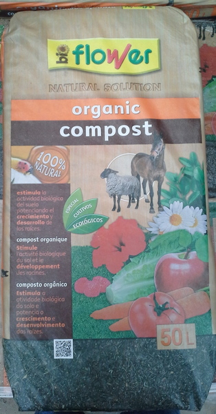 Compost orgánico en saco de 50 litros. Es un producto natural 100% que estimula la actividad biológica del suelo y mejora sus propiedades físicas y químicas. Recomendado como enmienda orgánica. Composición: mezcla de estiércol de ganado caballar, vacuno y ovino. Apto para agricultura ecológica.